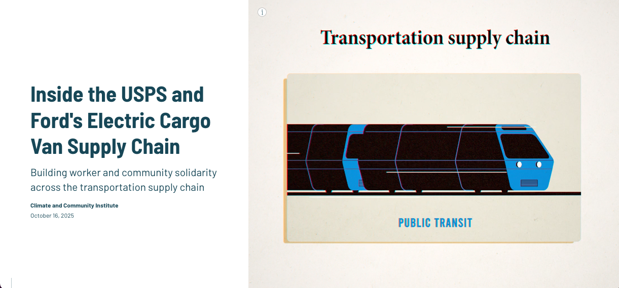 The transition to zero carbon transportation has initiated major social and economic shifts: a boom in new mine development to supply transition minerals needed to manufacture millions of new electric vehicle batteries; a restructuring of the auto manufacturing industry, with shifting factory locations and outputs and joint ventures between auto makers and battery companies; a shift to private electric automobiles overshadowing needed improvements to transportation systems for people who do not drive. As it is currently unfolding, the transition will leave behind workers, nondrivers and impacted communities along the supply chain. But these communities have an opportunity to join forces, gain power, and take control of their futures.